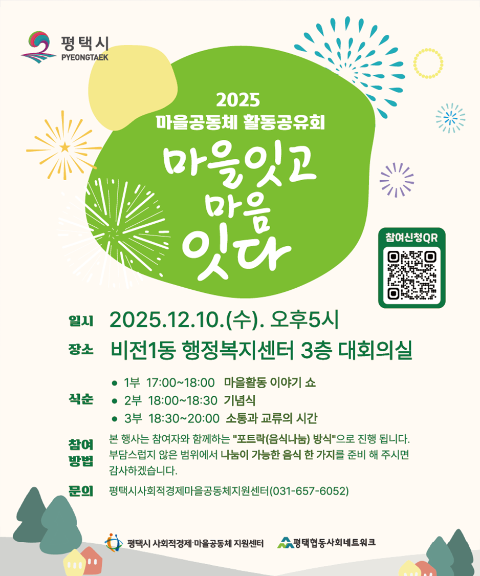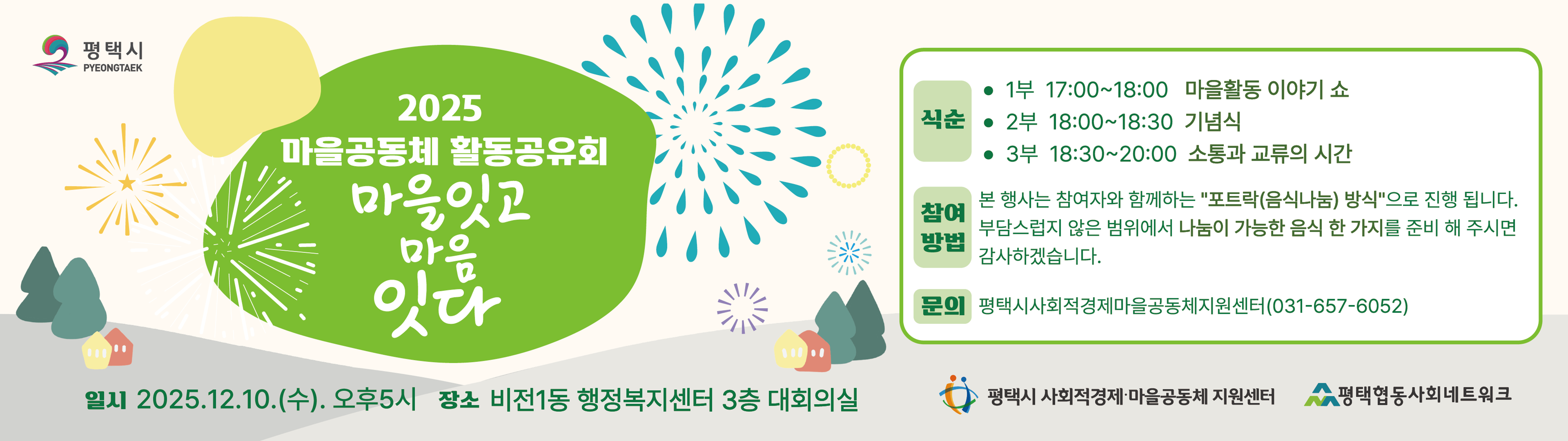 공지사항 + 더보기 [모집]2025 사회적경제 강사양성과정 모집2025-11-25 [사전신청]2025 평택마을 활동공유회x마을이야기쇼2025-11-24 [모집]마을공동체 시민강좌- 김민섭 작가 "공동체를 생각하는 다정함에 대해"2025-10-31 [센터모집] 2025년 창업아카데미 심화과정 모집2025-10-30